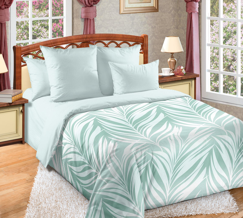 Аппликативный рисунок пальмовых листьев - это тренд сезона. Пастельный мягкий тон, инверсия, крупный масштаб и изящная пластика листьев обогащаются горизонтальной линейной структурой мятного фона, создающей тональные переливы. Метрический ритм ткани-компаньона усиливает выразительность и эксклюзивность комплекта. Колористика и пластика композиции настраивают на бесмятежность, придают спальне уют и умиротворение.