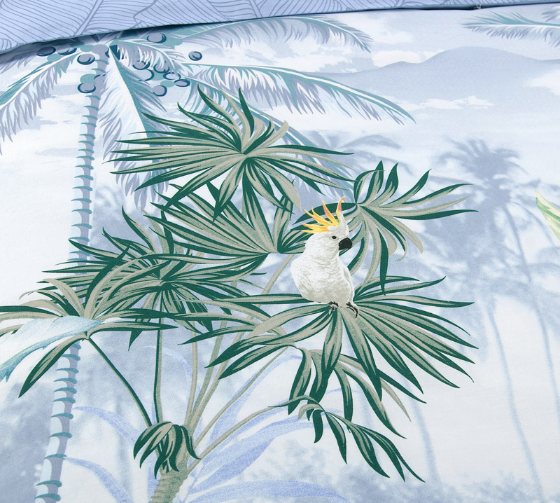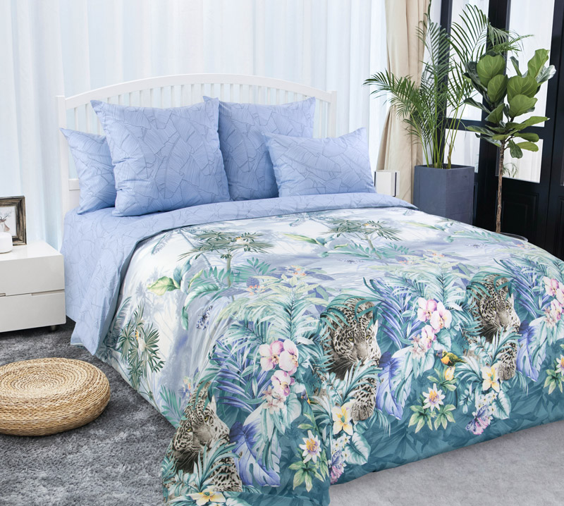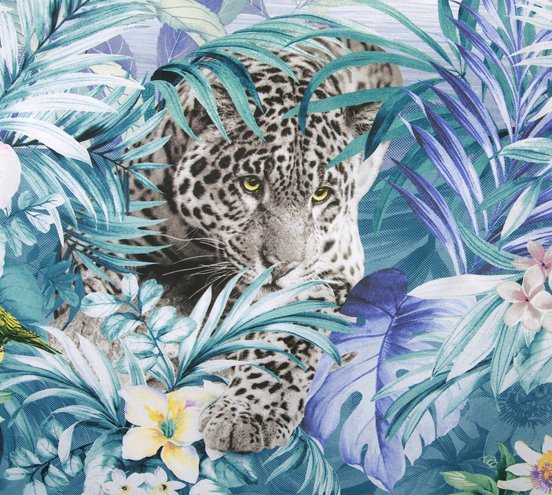 Свободный и вдохновляющий принт этого постельного комплекта навеян обаянием тропиков. Пышная экзотическая зелень, зубчатые листья пальм, нежно-розовые орхидеи и фигуры затаившихся в листве леопардов все это моментально создает оптимистичное, приподнятое настроение. В качестве компаньона выбрана светло-синяя ткань, цвета неба и морских волн.