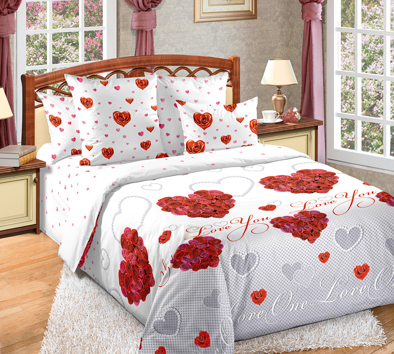 Сочетание ярко-красной колористики и стилистики романтического прованса этого комплекта сделает спальню центром притяжения в вашем доме. Равновесие между активной цветочной декоративностью красных сердец и нежным белым фоном достигается серебристо-серым градиентом, ромбической сеткой и каллиграфическими шрифтовыми вставками.